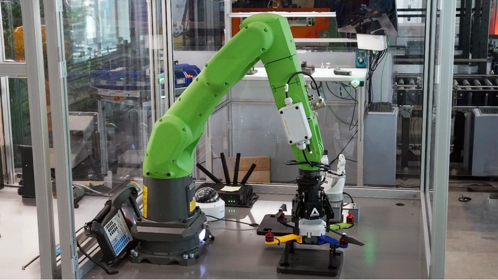 The drone test bench verifies that every assembled drone is complete and functional. A Fanuc CR7 robot with a 3-finger Apicoo Robotics gripper picks the drone from the conveyor, performs a weighing step and compares the result with a target value. In a second step the drone is clamped in a dedicated gripper, the motors are started and a force sensor measures the thrust from the propellers. Analyzing the force profile allows malfunctioning motors or propellers to be identified. The demonstrator combines robot handling, weighing, force measurement and motor control in a realistic end-of-line scenario and is also used as a 5G communication use case.