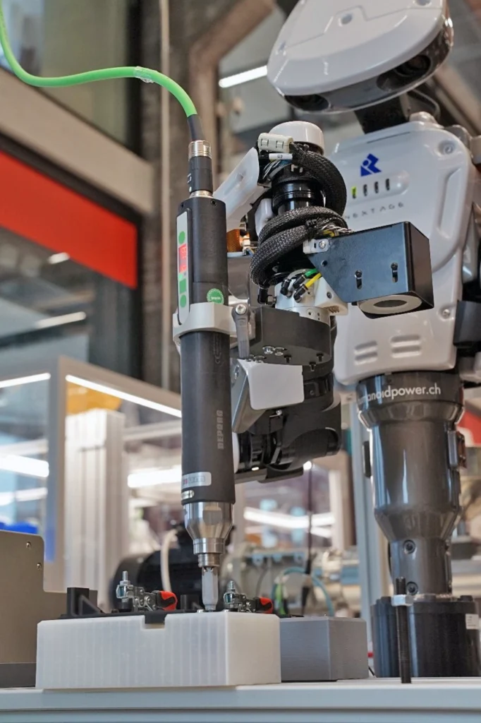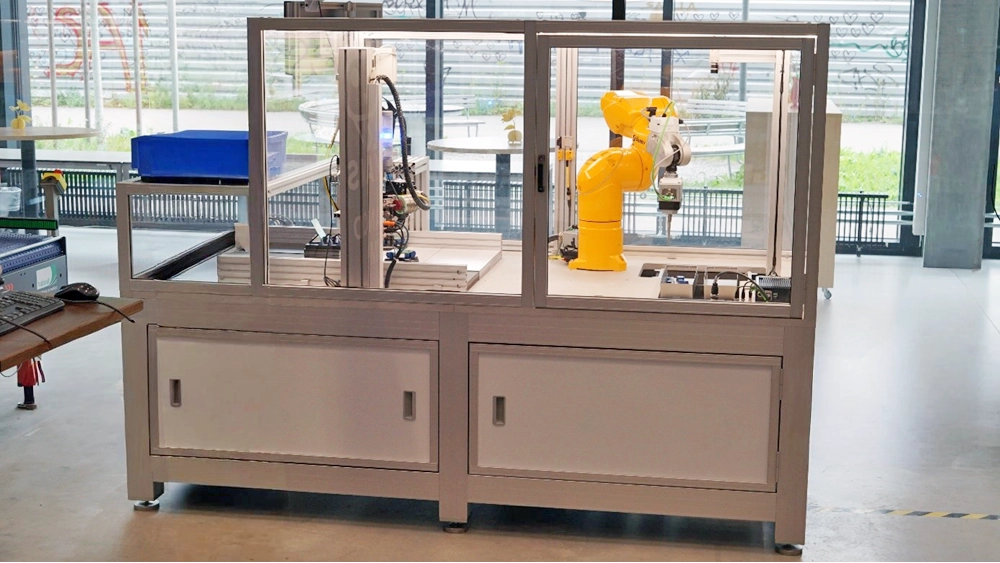 This cell uses a Kawada Nextage humanoid robot from ERT Solutions to fasten screws on drone arms. A dedicated fixture keeps motor and arm precisely aligned so that the screw holes match. A stereo camera in the head detects reference markers at the screw feeder and defines a coordinate frame. Mono cameras in the arms detect the screw holes and the screws. The robot picks a screw from the distributor and fastens it with the AxNum screwdriver with controlled torque. The cell is designed so that both arms can later be used in parallel. It demonstrates humanoid robot programming, robust fixturing and camera-based positioning for collaborative assembly scenarios.