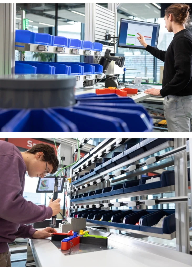 These two stations from Phoenix Mecano and Bossard guide operators through the final assembly and packaging of the drone. In the Bossard version, a rotary table offers several positions for manual tasks. An AxNum smart screwdriver with torque monitoring is used for critical fastenings. A smart trolley with integrated scales under each box detects when parts are taken and automatically advances the digital work instructions. The concept offers more storage capacity than classic kitting and supports different product variants. A tablet interface can host assistance applications such as an LLM-based helper for work instructions and checklists.