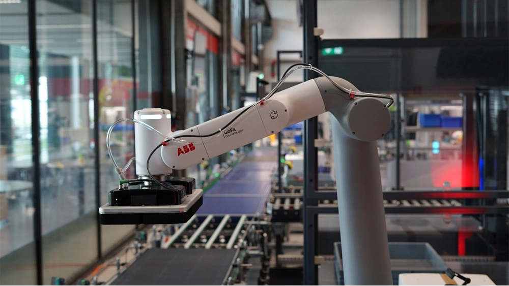 This demonstrator shows an end-to-end material flow from storage to outbound shipping. The system is modular and uses intelligent logic to place frequently used boxes near the loading points. At the palletizing station an ABB GoFa collaborative robot with SMC Vacuum pad builds mixed pallets according to orders and, in a full scenario. The cell is also a use case for Realwear AR glasses, Augment IT user guidance tool and user-friendly cobot programming with solutions such as AICA.