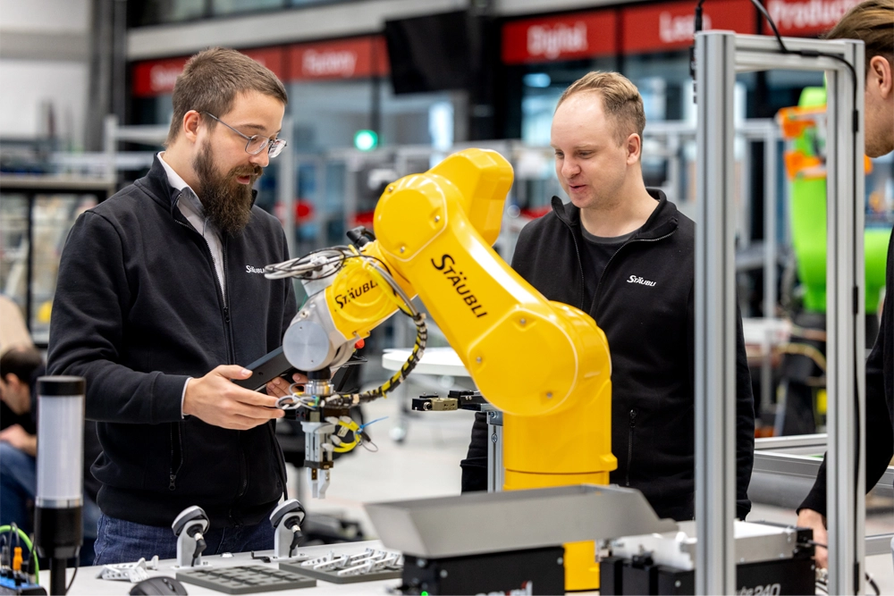 The flexible parts sorting cell automates simple pick and place tasks that are still often performed manually. It is currently configured with small watch parts that are sorted and placed onto trays or pallets. The Stäubli TX2-60 robot is programmed with VAL block low-code tool so that new processes can be defined in a few hours. Trajectories, gripping strategies and target layouts can be adapted quickly to new parts. The cell is suitable for high-mix, low-volume environments and shows how intuitive robot programming and modular tooling enable cost-efficient automation of labor-intensive tasks. An Asyril Asycube with EYE+ flexible feeder takes care of the work of finding the parts from bulk.
