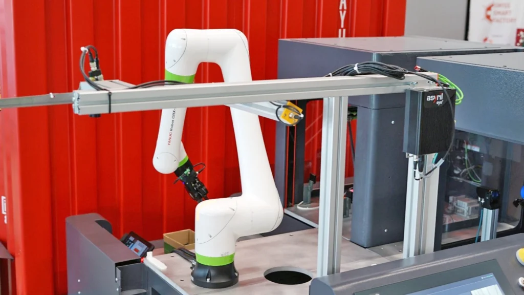 The Production Container is a next‑generation mobile 3D‑printer farm with 12 FDM printers handling PLA, ABS, and other materials. Automated with WANDELBOTS’ NOVA and a Yaskawa HC20 cobot using a Zimmer gripper, it selects printers by material and color, oversees prints, and moves finished parts once the MES, built on FlowFuse, releases an order. This Station features a cabinet free design combining IPCs and IO-Link sensorics.