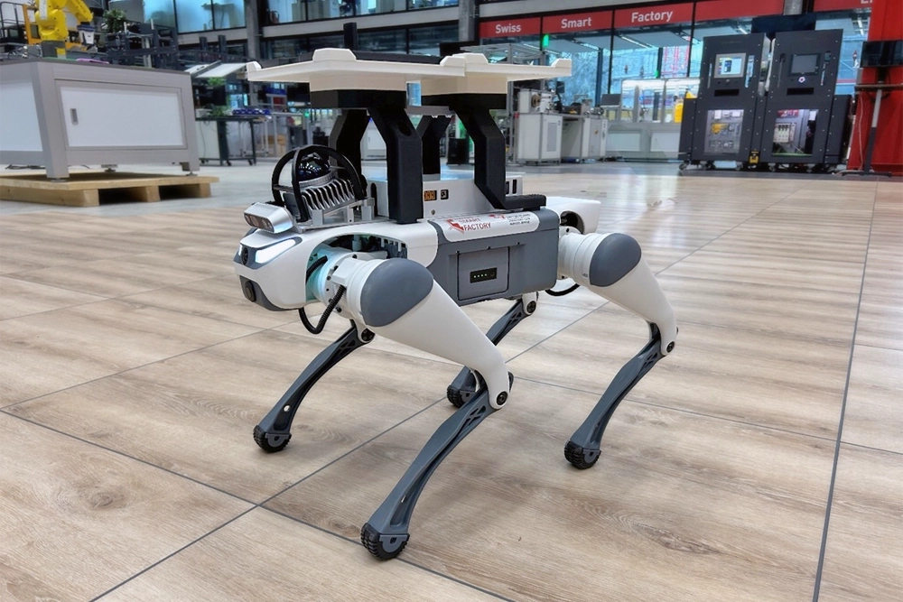 Quadruped robots are game changers in the field of inspection and autonomous navigation as they can easily walk over obstacle over autonomous transportation system can’t. At the Swiss Smart Factory, we have started integrating them with handling robotic system, to ensure small workpiece pallets transportation.